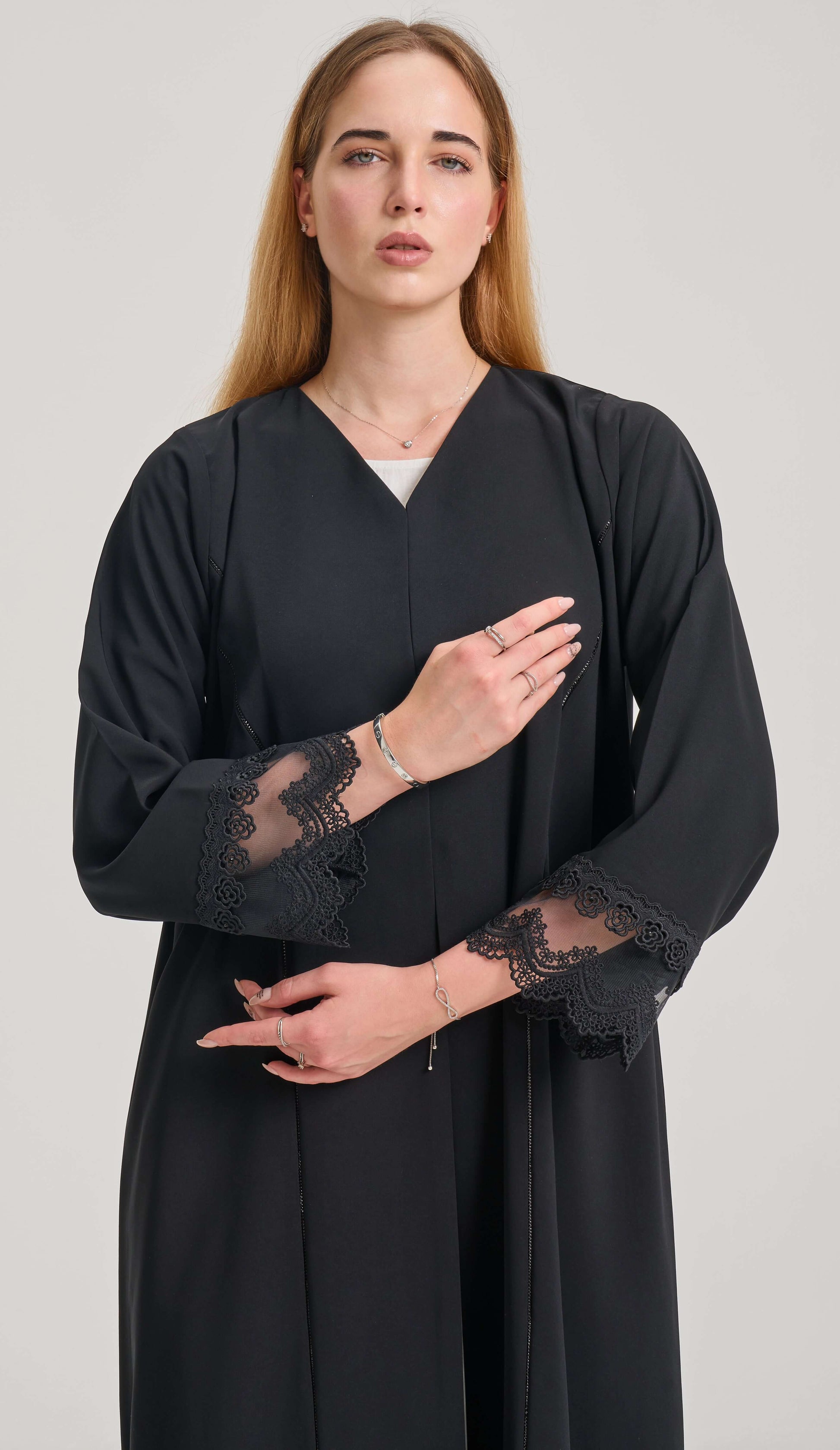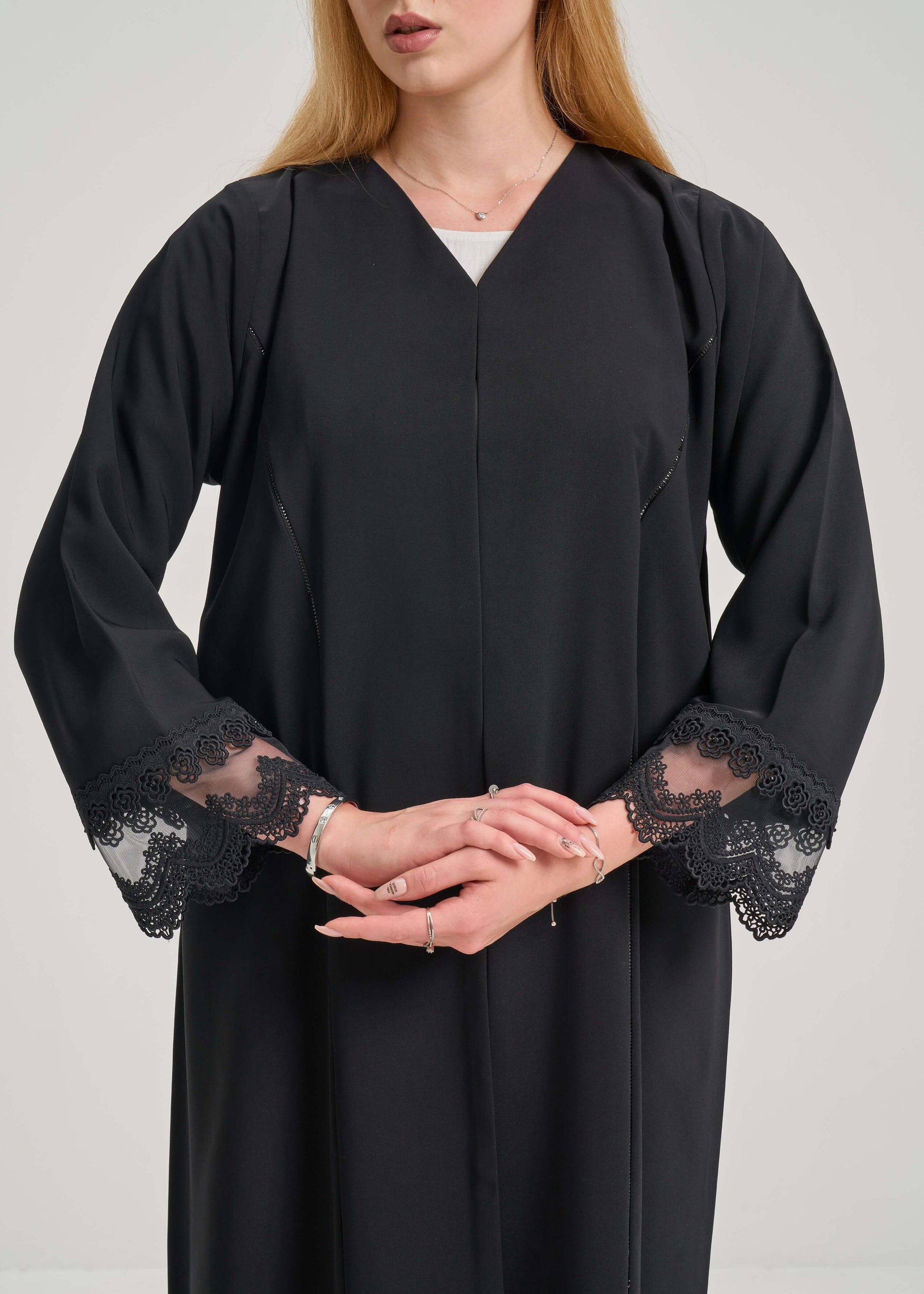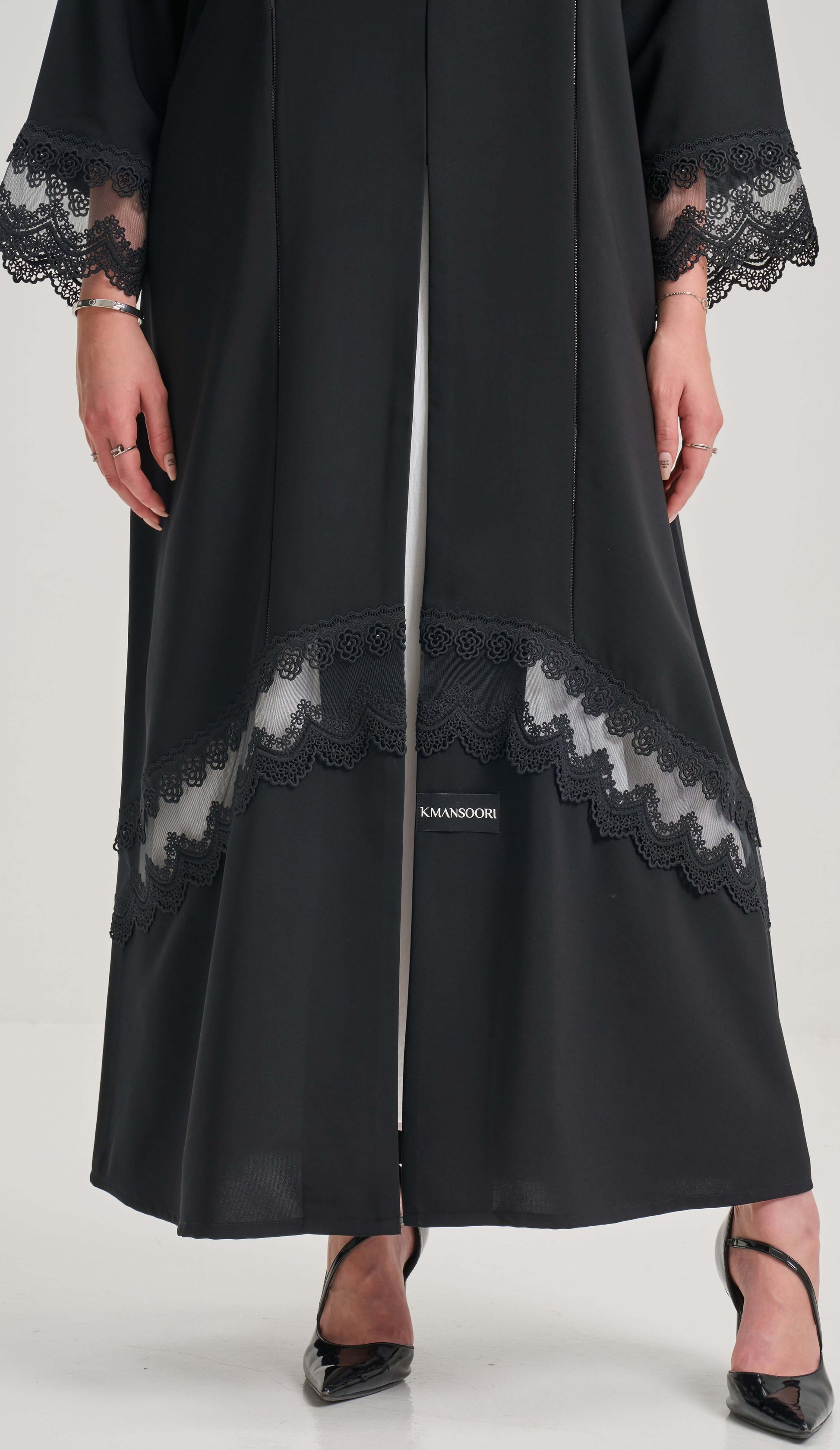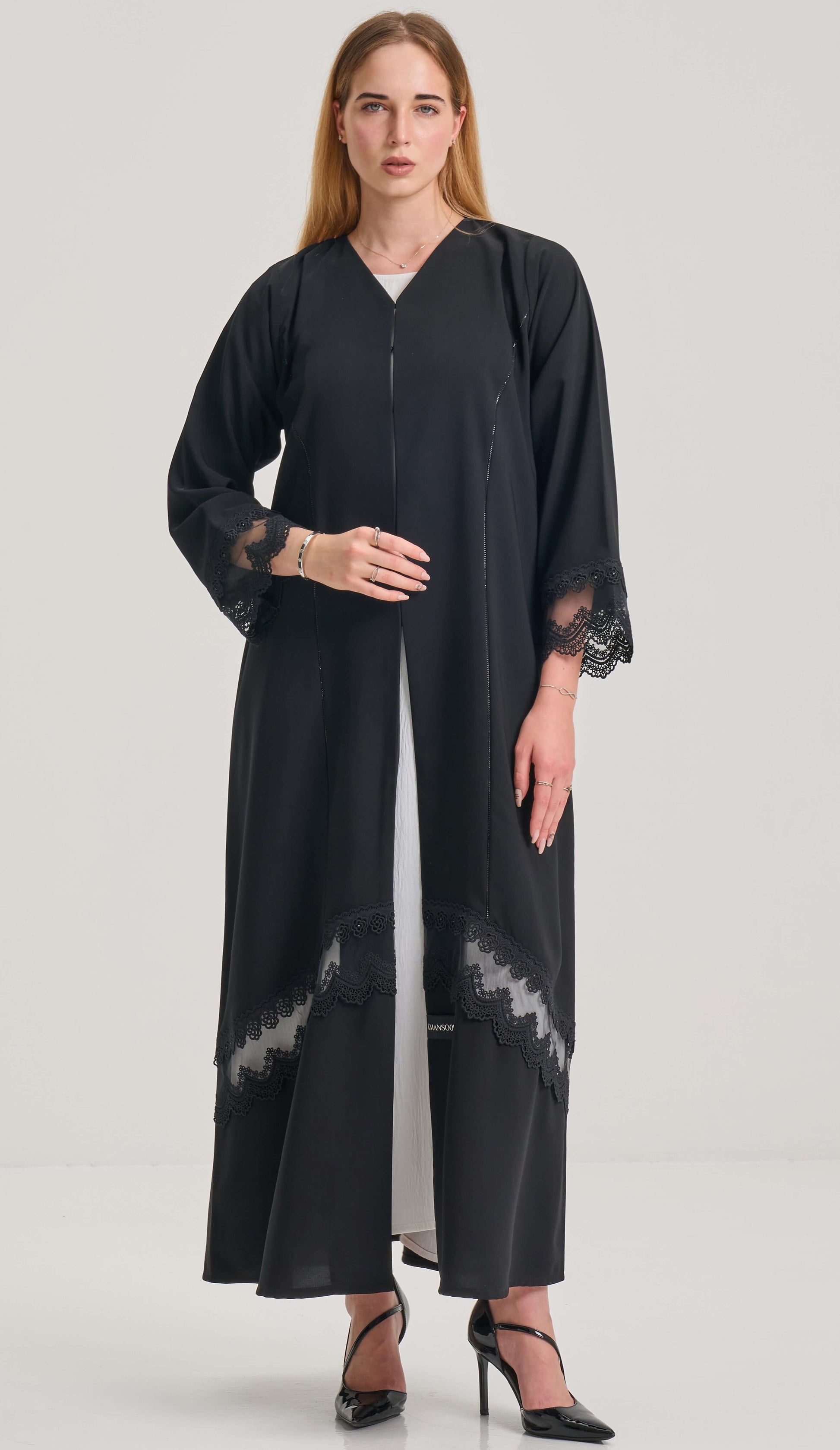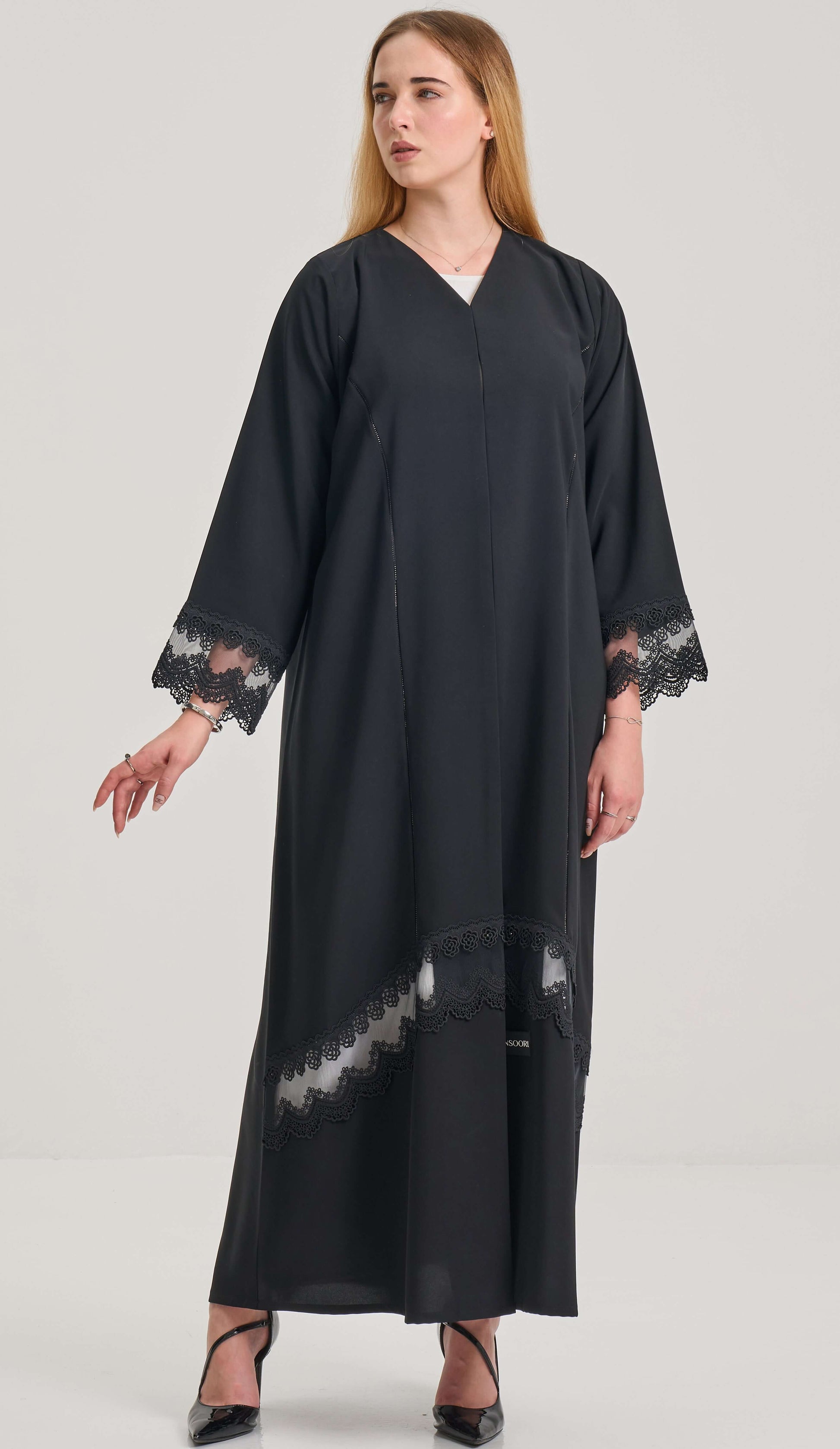 • الوصف: عباية سوداء بتفاصيل دانتيل
