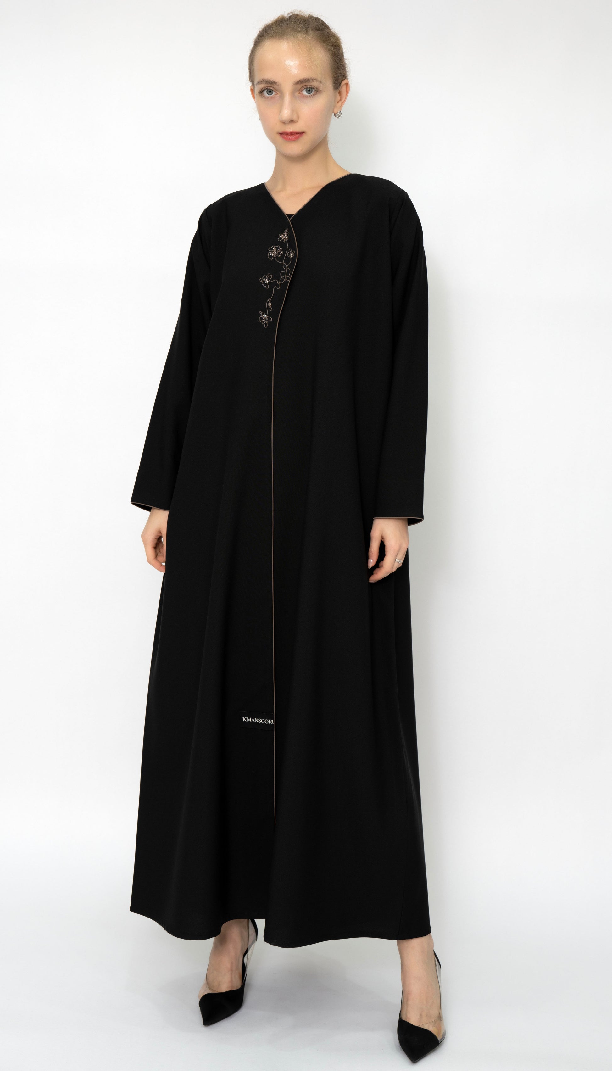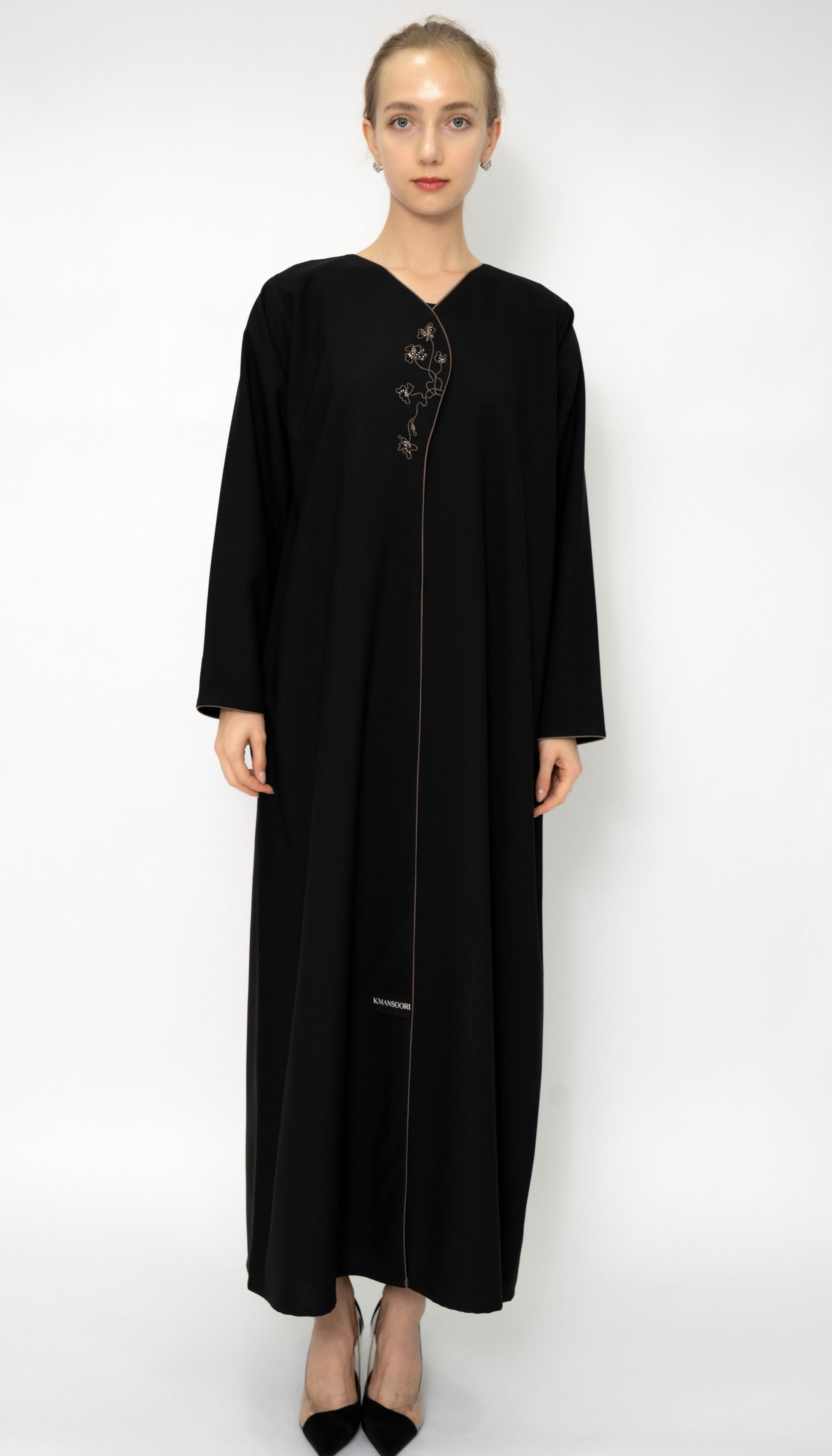 • الوصف: عباية سوداء متداخلة مع تطريز زهري ملون
