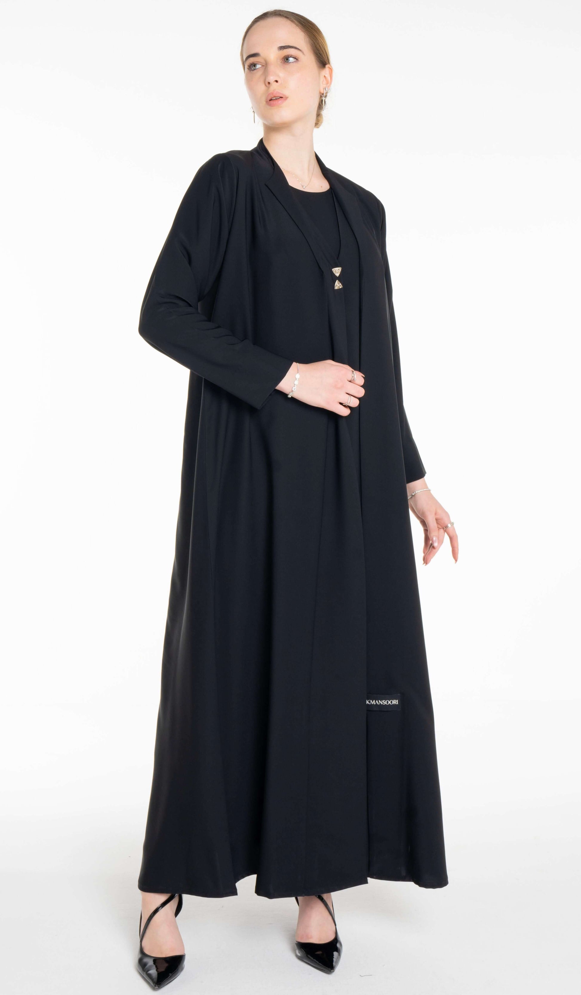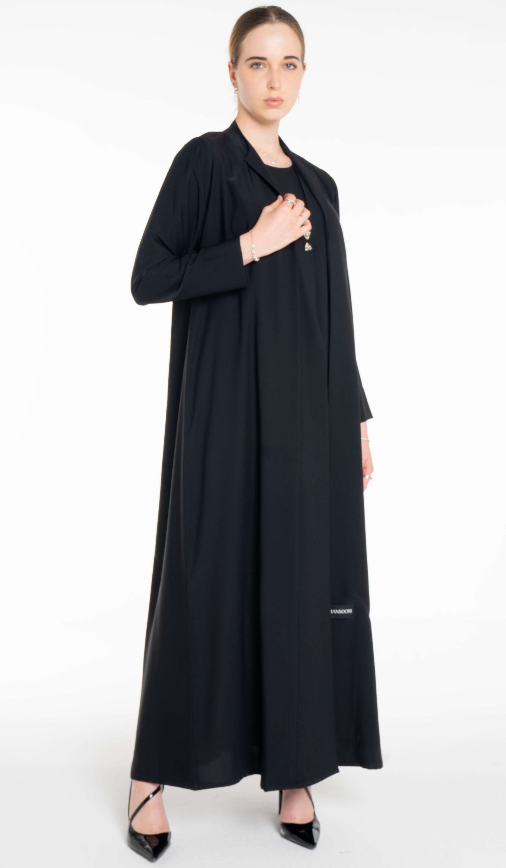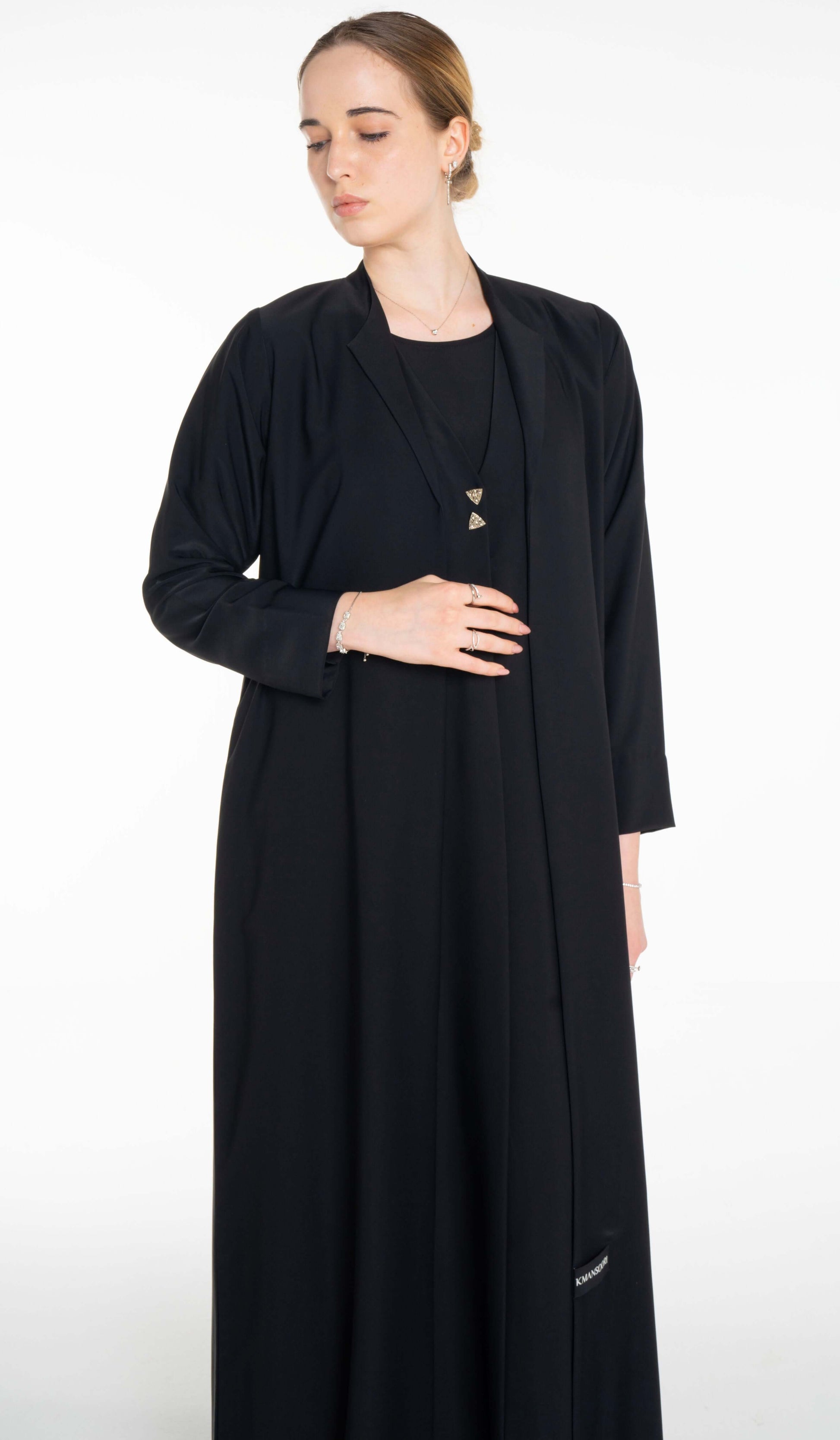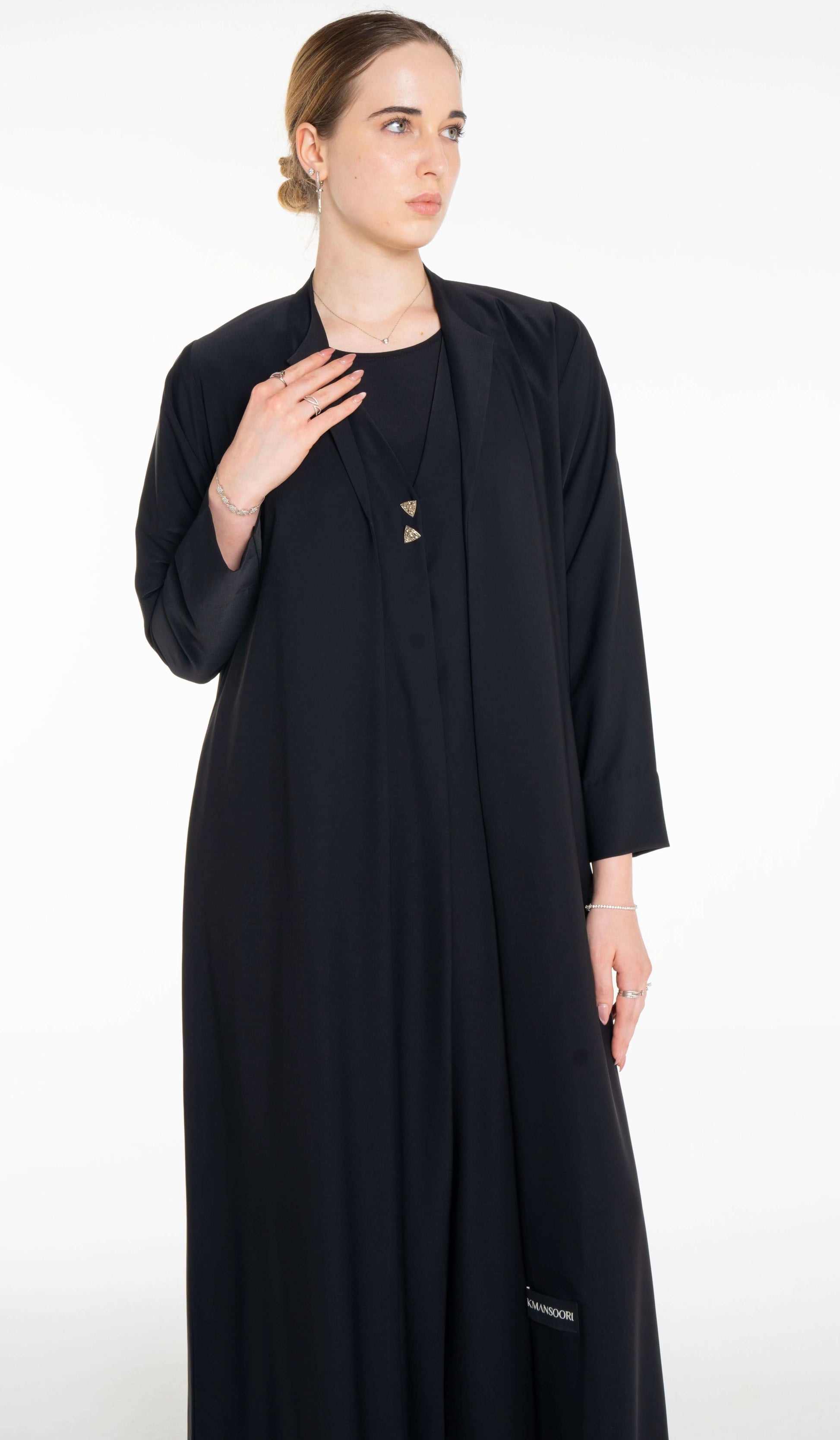 • الوصف: عباية سادة بتصميم ياقة مع أزرار معززة