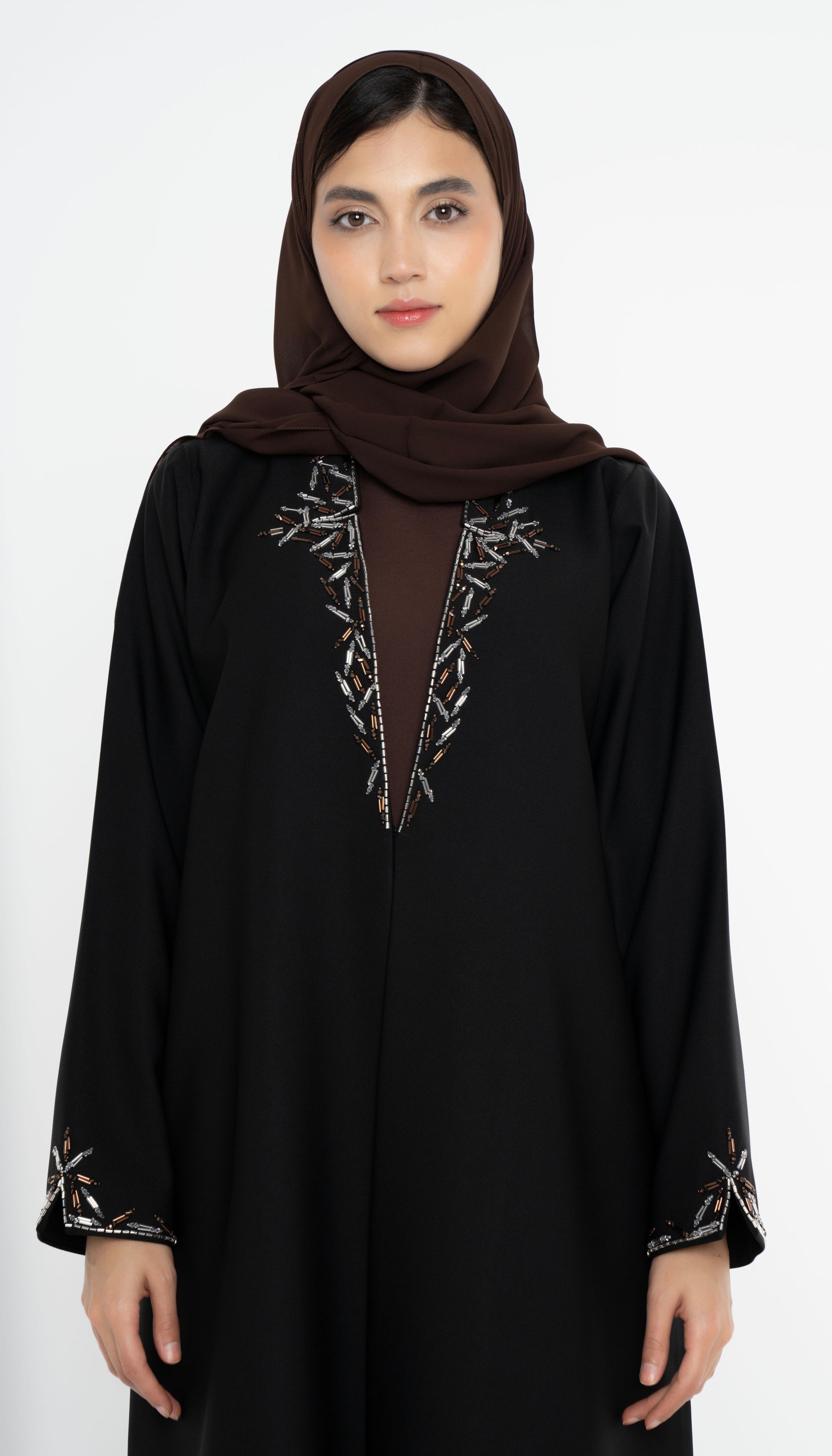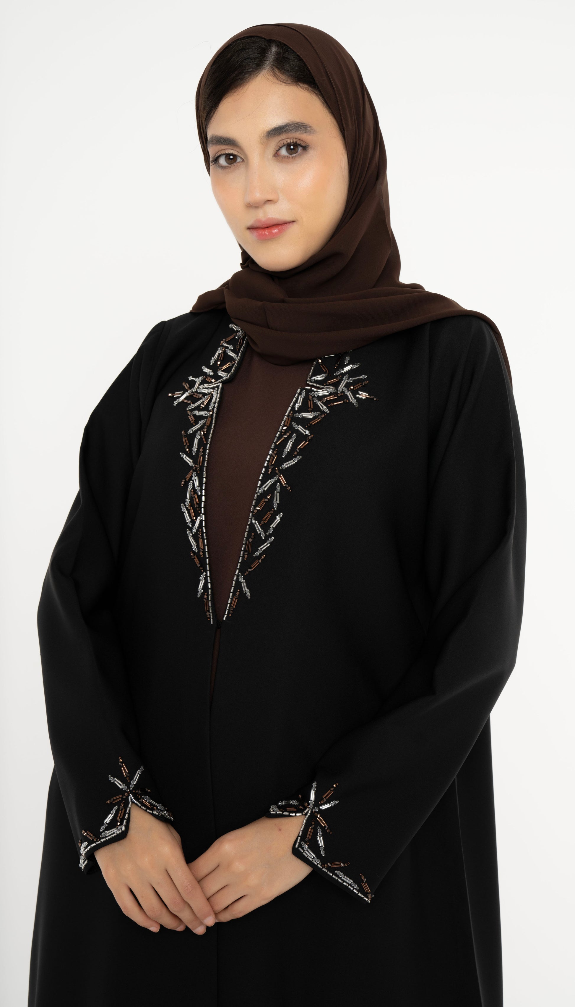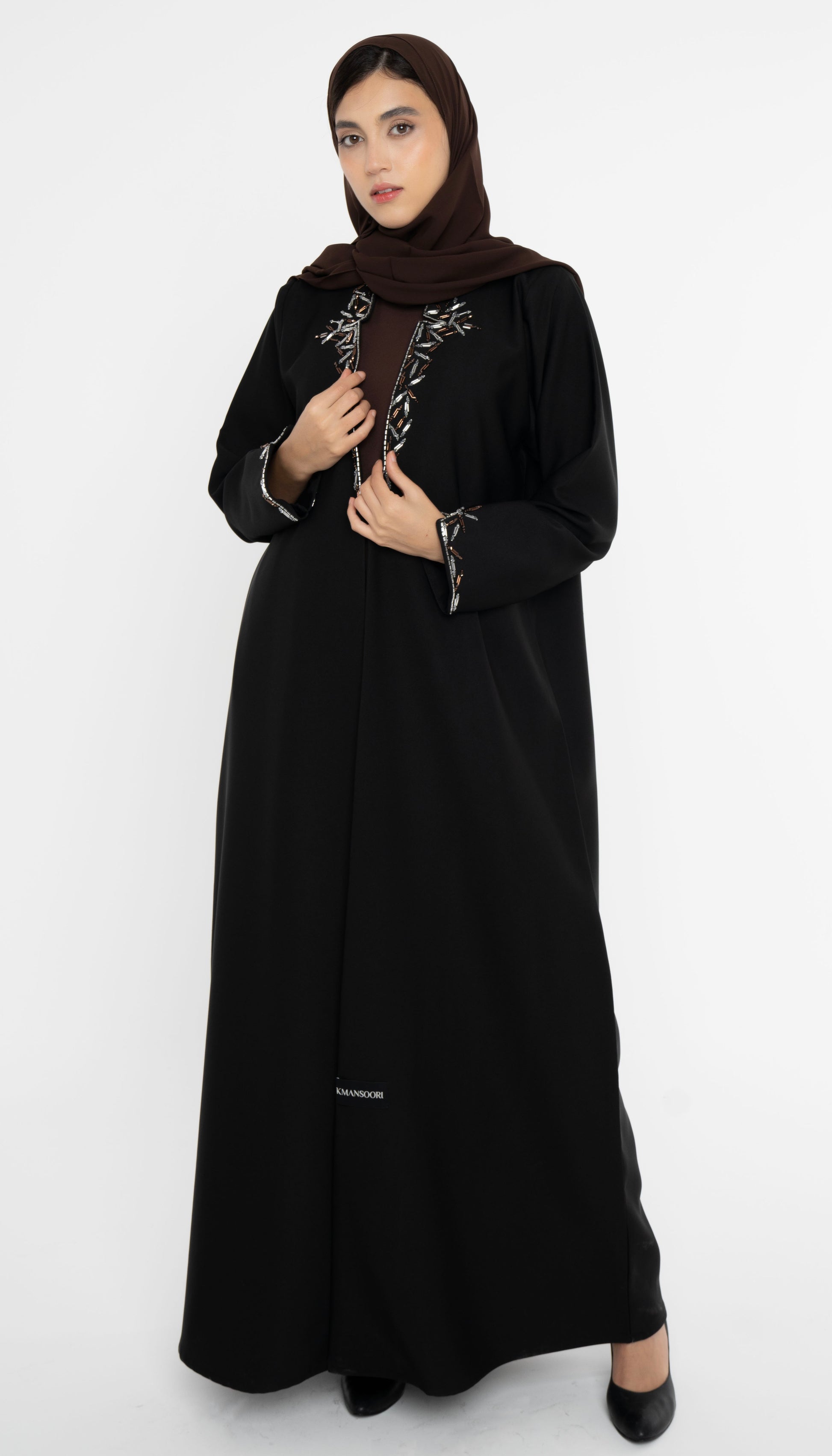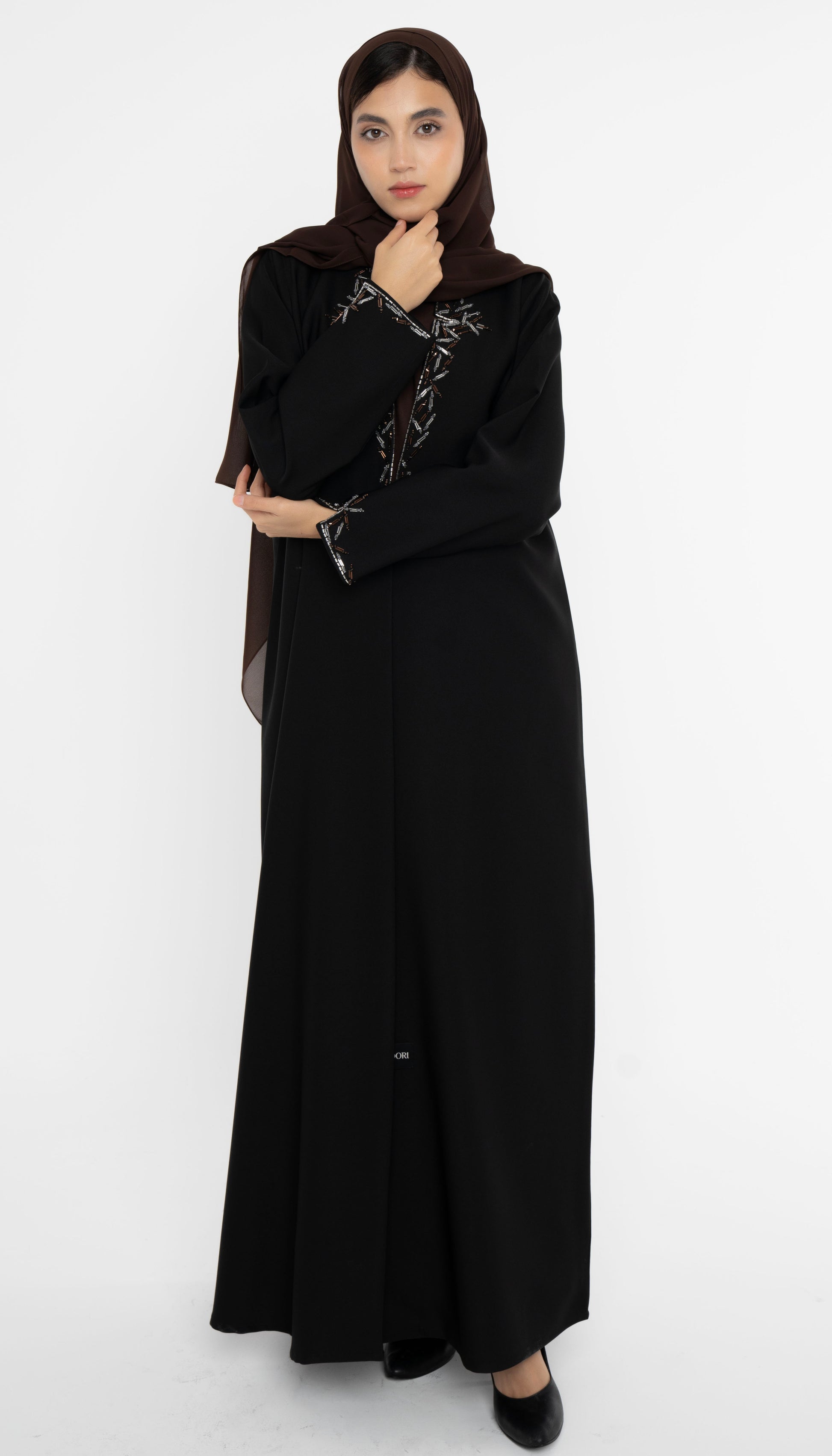 • Fabric Description: Black Colored Collared Style Abaya with Embellishments on Front and Sleeves