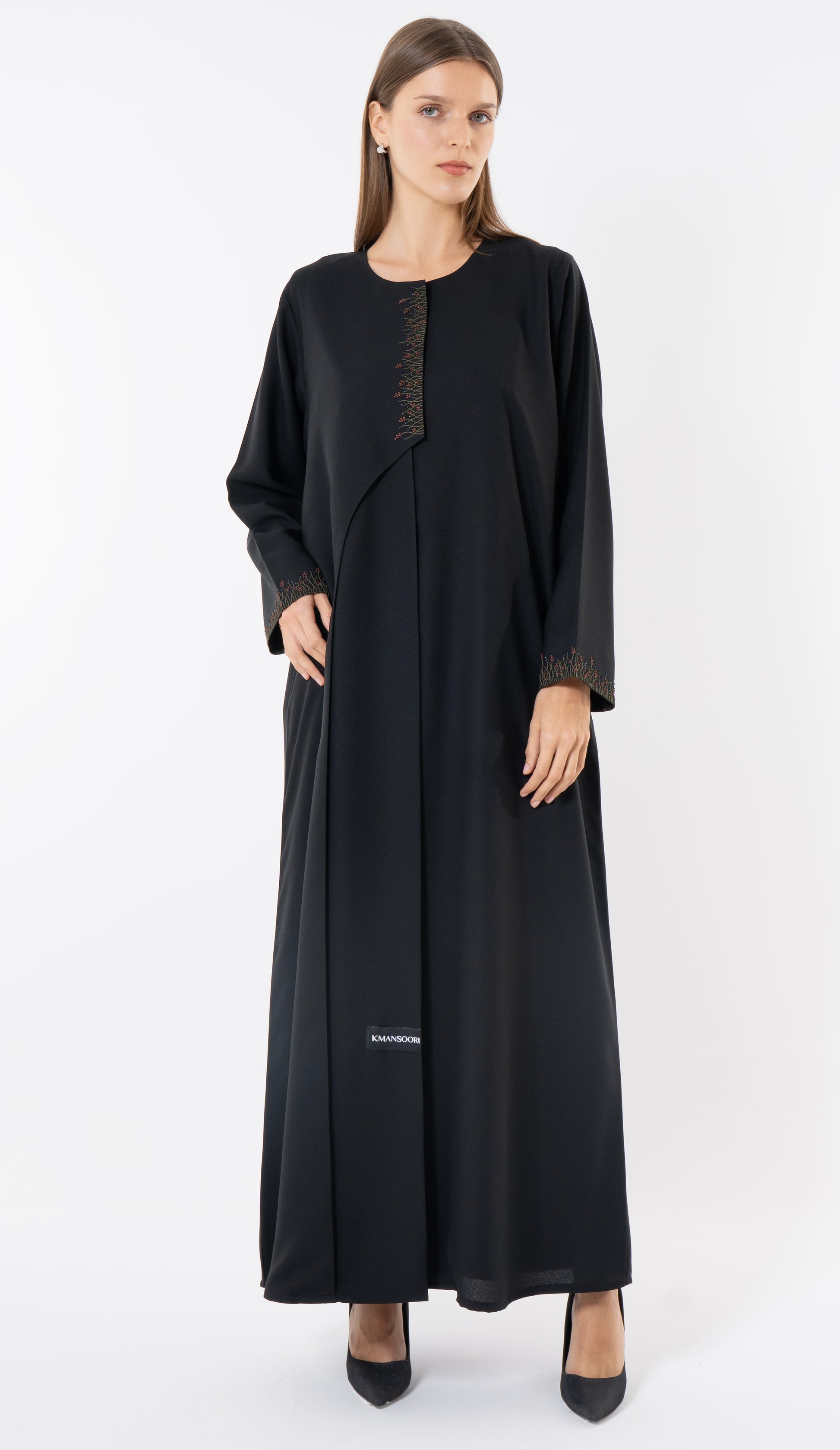 • Description: Black Front-Layered Abaya With Thread And Bead Embellishments