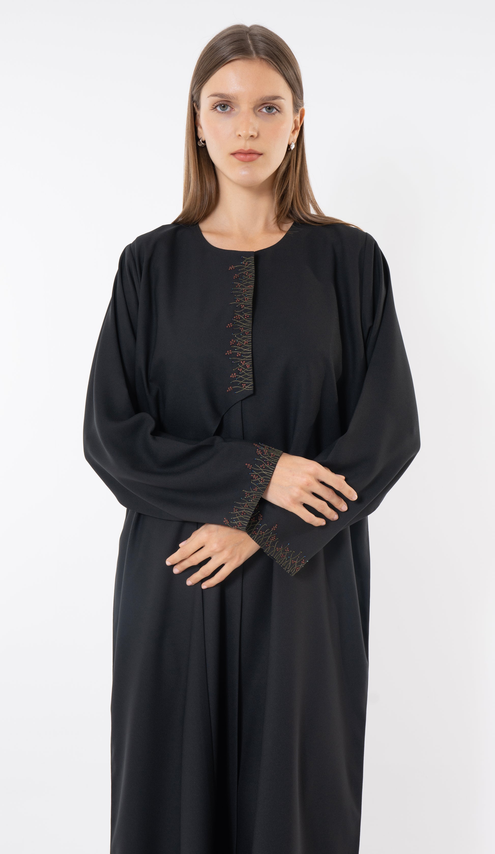 Black Front-Layered Abaya With Thread And Bead Embellishments
