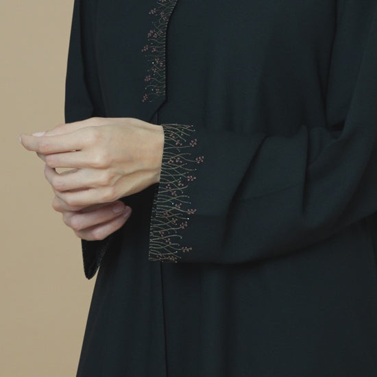 • Description: Black Front-Layered Abaya With Thread & Bead Embellished Details