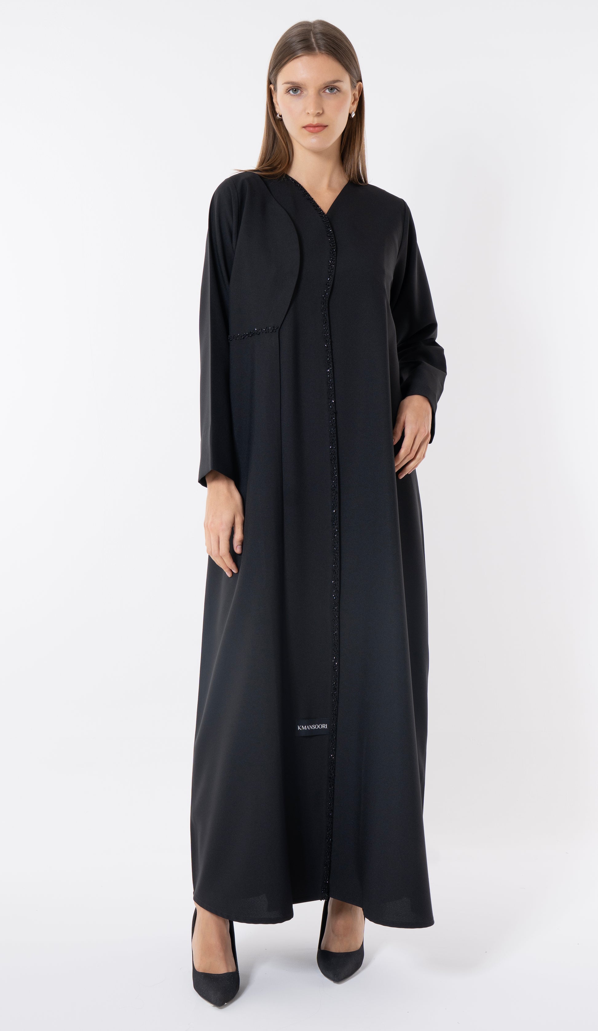 • Description: Black Overlap Curve Abaya with Front Layering and Beadwork