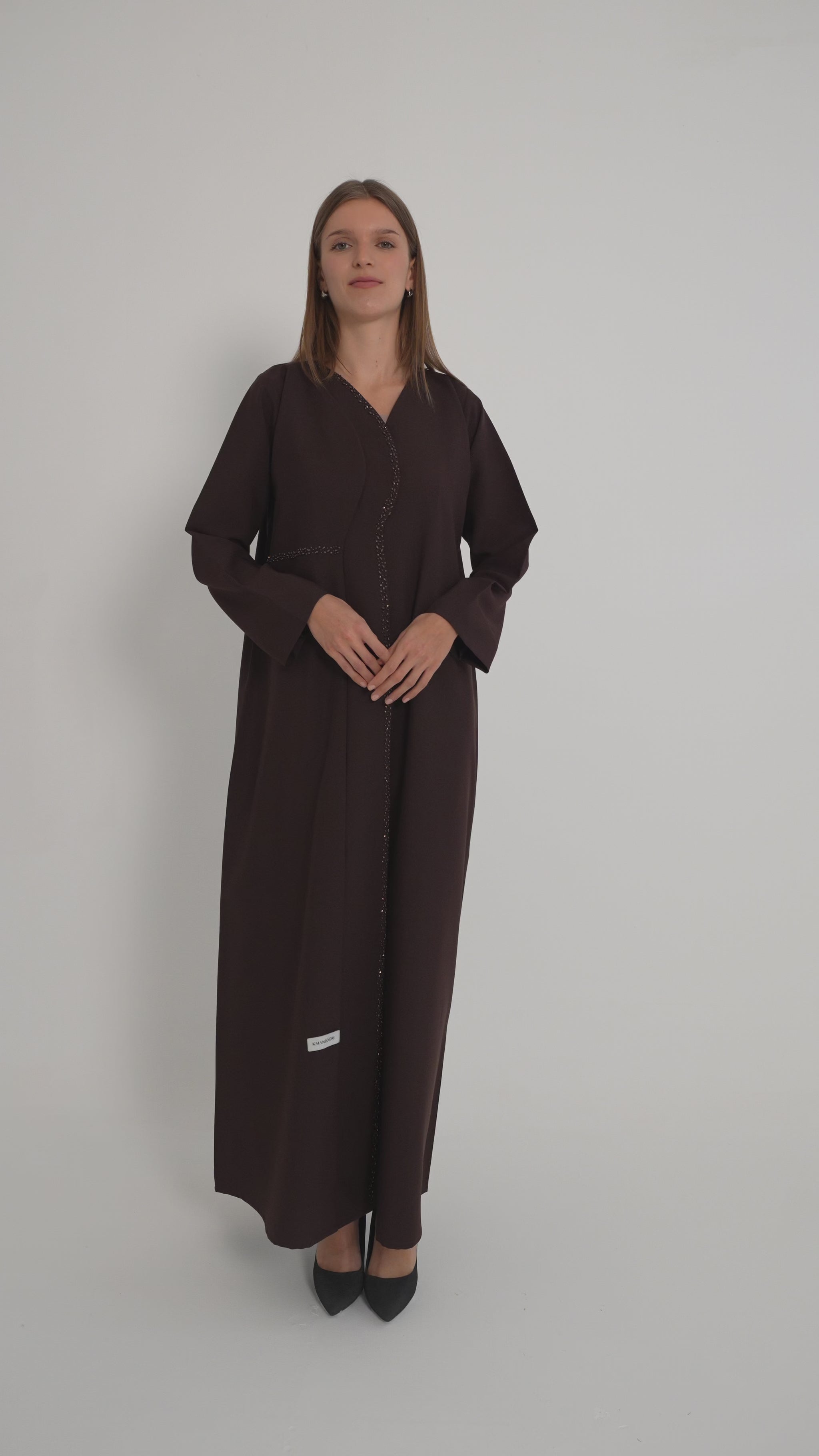 - Description: Dark Brown Layered Abaya with Overlap Curve Design and Beadwork
