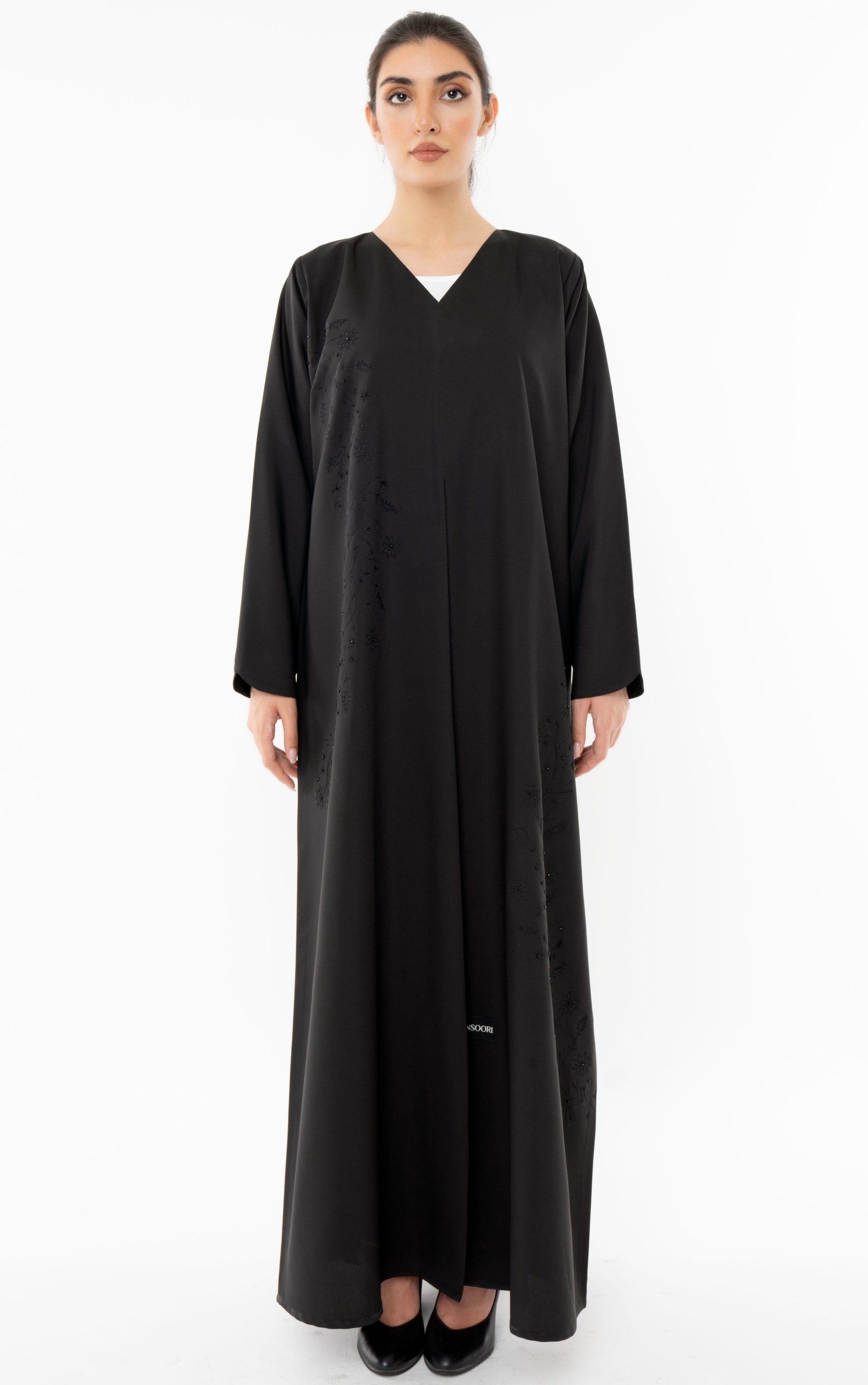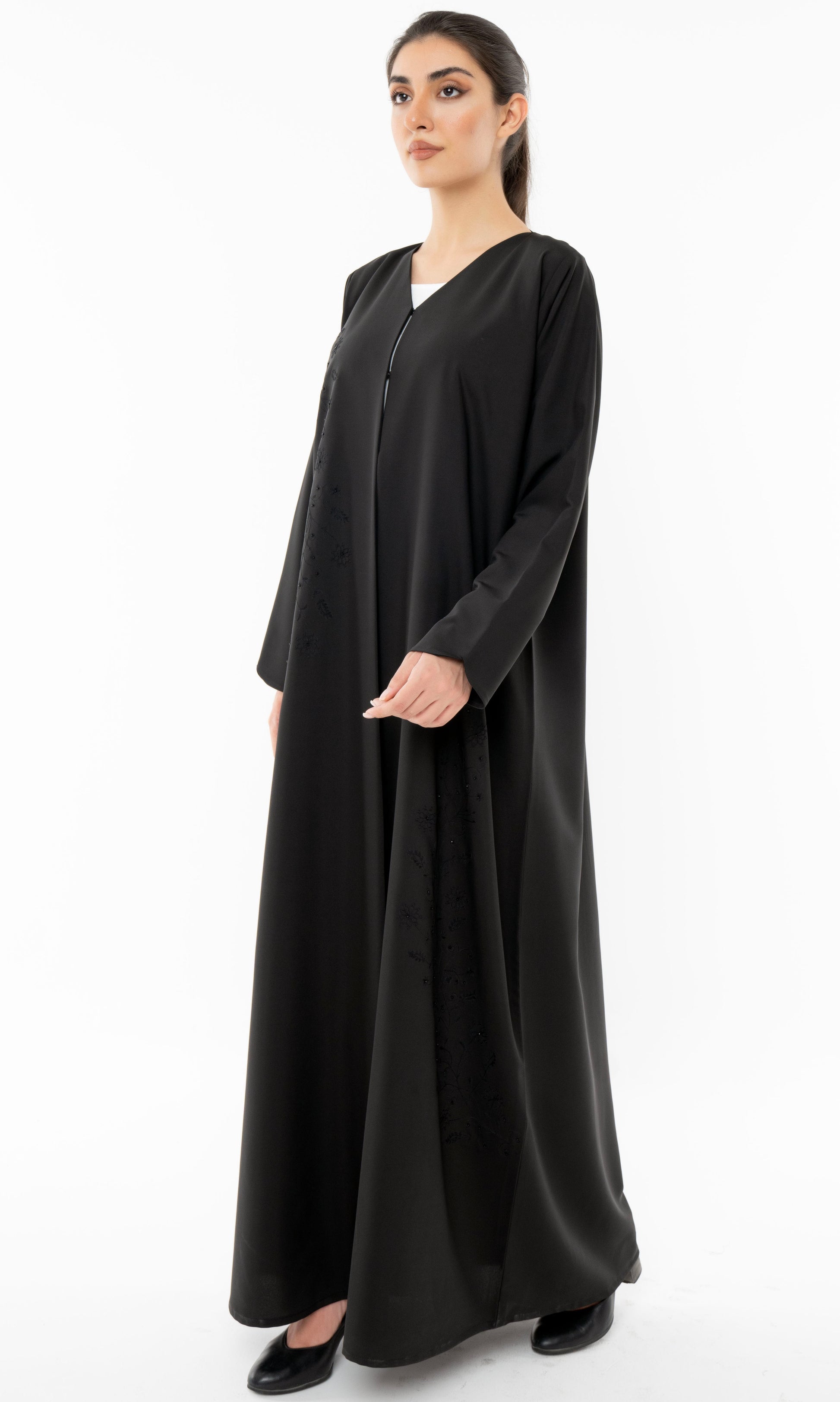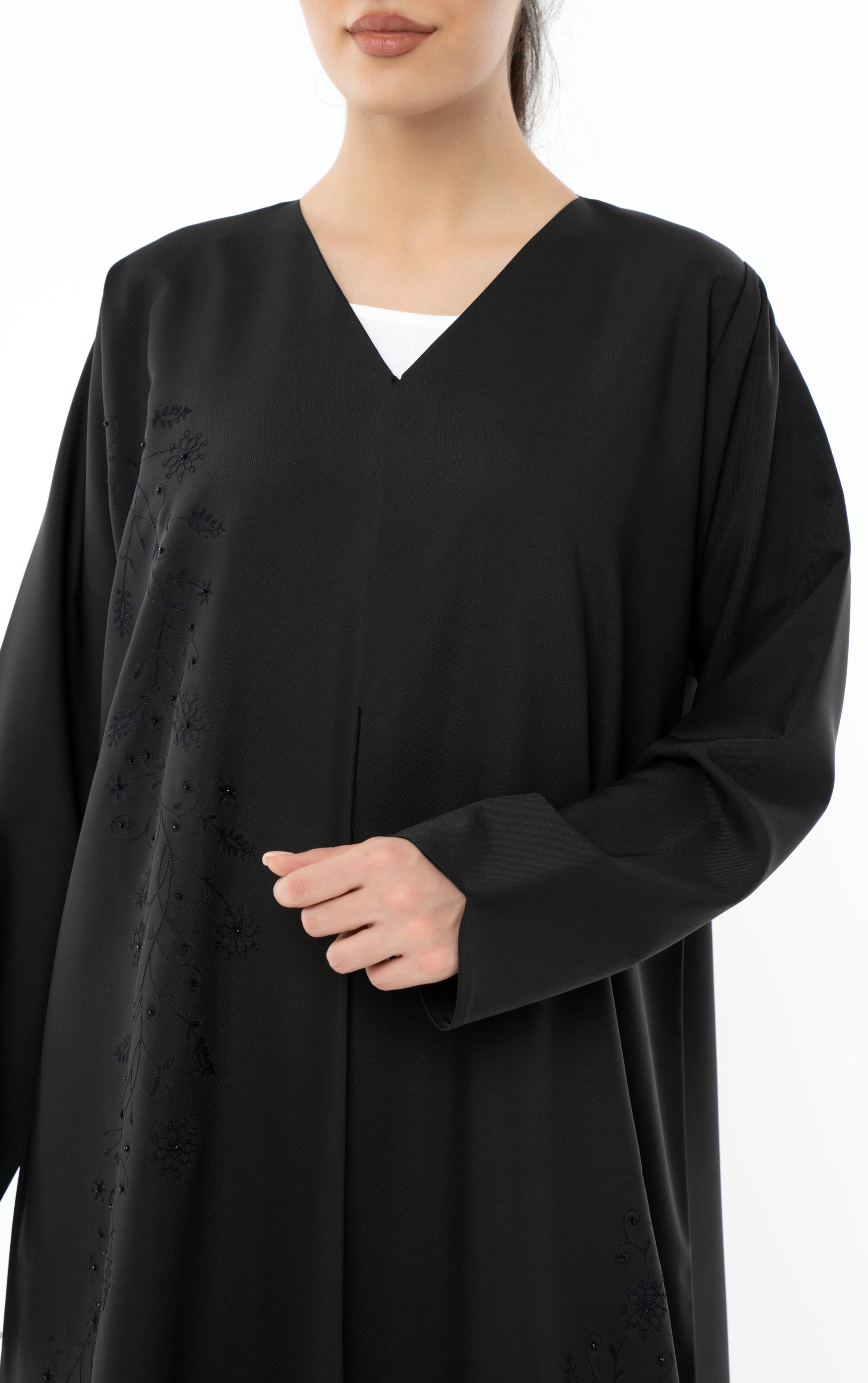 • Description: Floral Embroidered Abaya With Simple Bead Embellishments