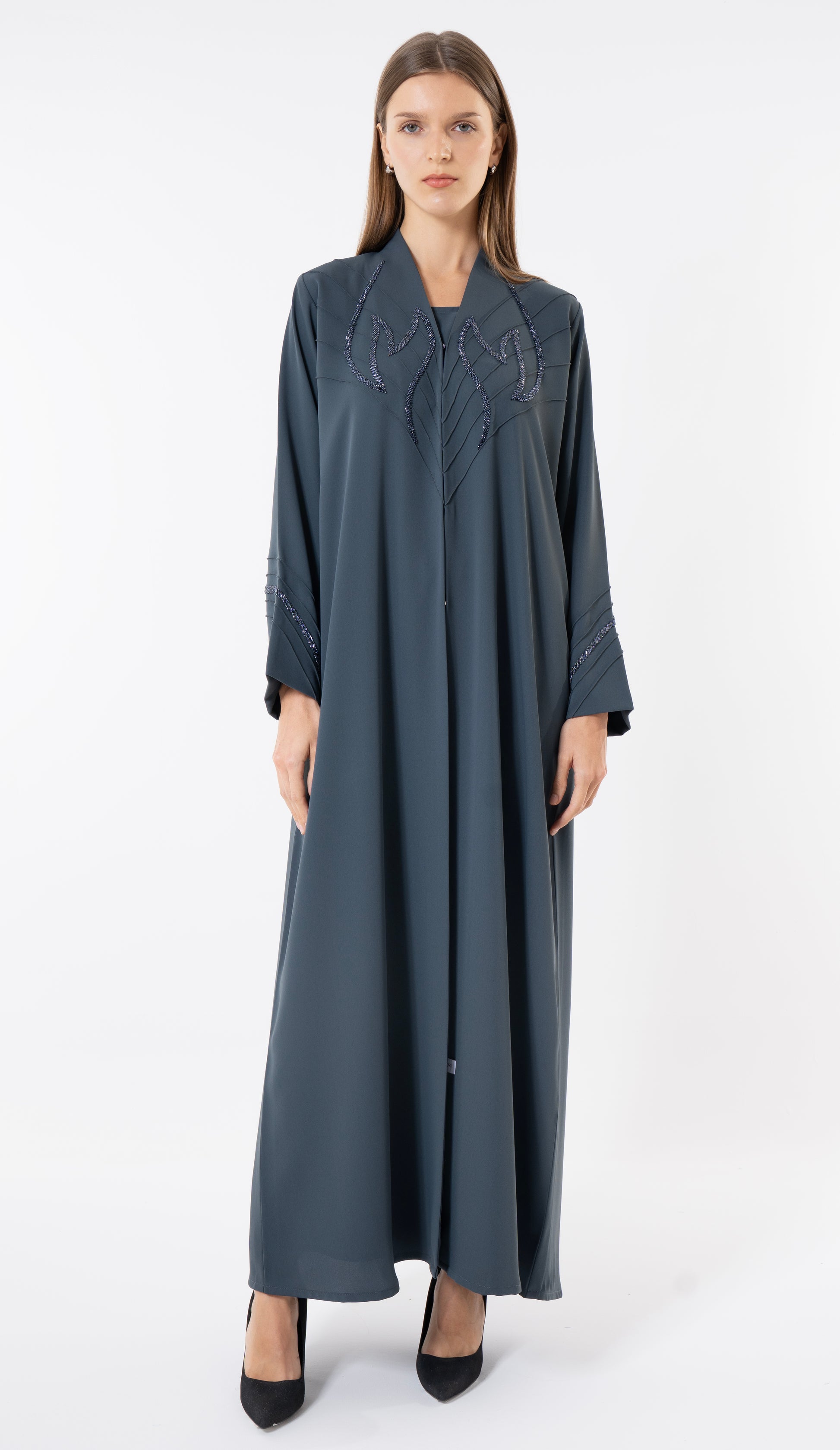 • Description: Grey Pintuck Abaya With Handworked Front And Sleeve Detailing