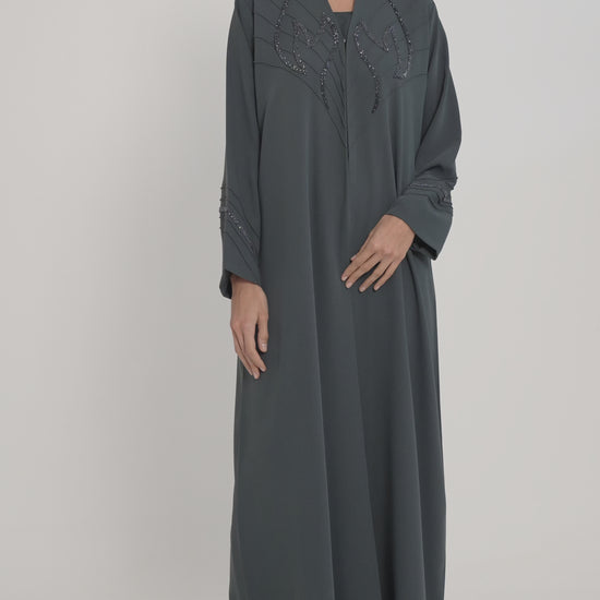 Grey Pintuck Abaya With Handworked Front And Sleeve Detailing